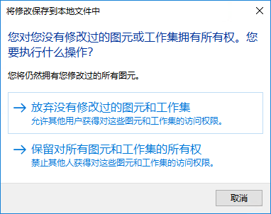 - 单击“保留对所有图元和工作集的所有权”,以保留对借用的图元和拥有的工作集的所有权。您将丢失已执行的修改。