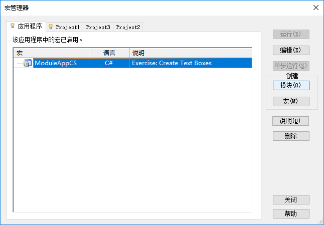 - 选择“应用程序”选项卡(对于应用程序级宏)或“项目”选项卡(对于文档级宏)。