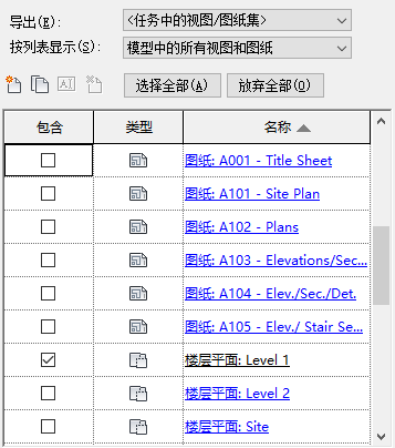 将模型导出为多种格式时,使用“导出”对话框上的工具来选择要包含的视图和图纸。保存选定的集以供以后重复使用。