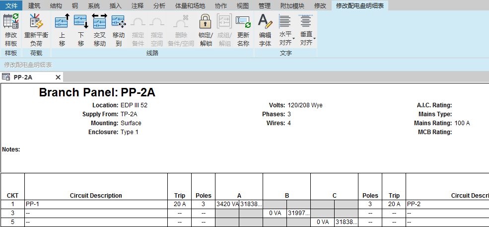 显示配电盘明细表时,可以在配电盘上重新排列线路,如将线路上移、下移、左移、右移、分组或锁定在某处。而且,还可以平衡各相位间的负荷、指定备件和空间,以及更新线路名称。