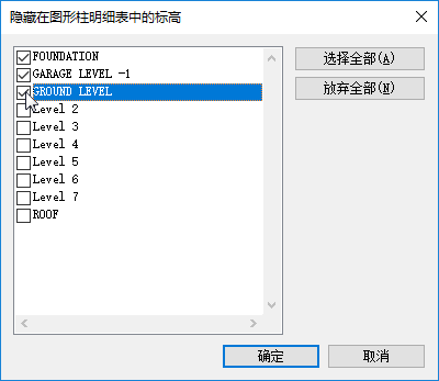 将打开“隐藏在图形柱明细表中的标高”对话框并列出该项目中的所有标高。