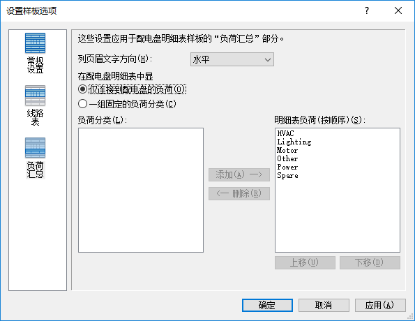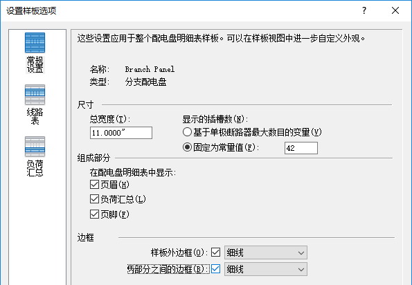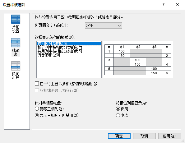 可以自定义配电盘明细表的外观。 可以指定常规外观的设置,以及线路信息和负荷汇总。