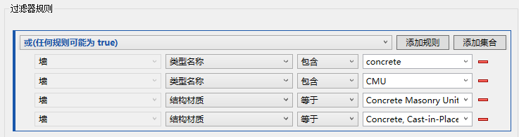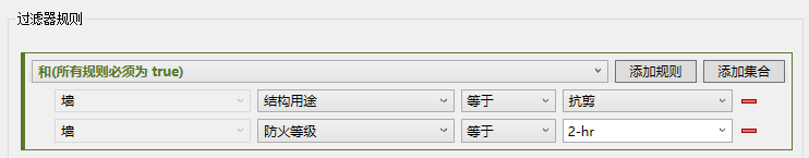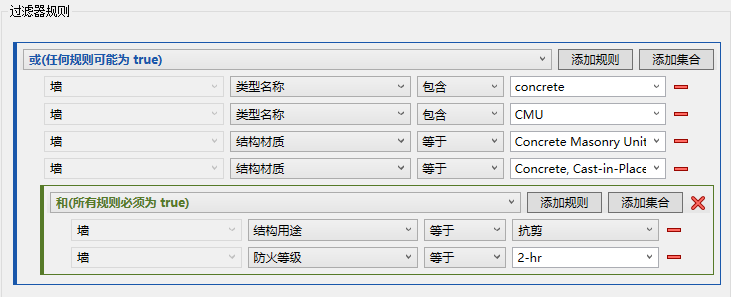 在此情况下,要识别该模型中所有拥有 2 小时防火等级并且由混凝土制成的剪力墙,您必须从 AND 规则集开始,并在其中嵌套 OR 规则集,如下所示: