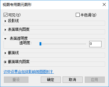 - 表面透明度:只显示图元线而不显示表面。使用“透明度”滑块设置表面透明度百分比。