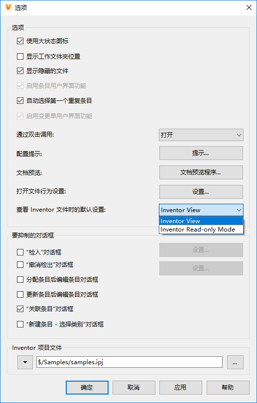 - 指定用于查看 Inventor 文件的默认设置。根据您首先安装的产品以及您的系统上可用的产品,默认选项将处于选中状态: