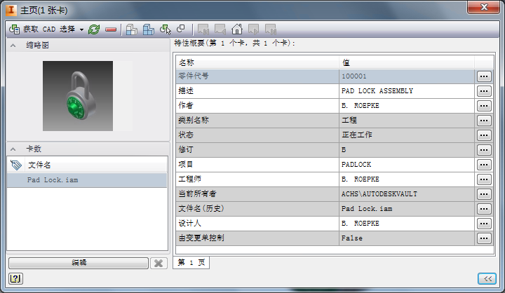 数据卡功能提供了指定给一个文件或一组文件的元数据的摘要,通过单点访问即可方便地获取这些摘要。使用数据卡,可以确定文件的 Vault 状态、查看文件的缩略图以及查看和修改特性信息,而无需离开 Inventor 应用程序。