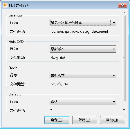 确定 Inventor、AutoCAD 和 Revit 文件是由最新版本、上次运行的版本,还是保存文件的 CAD 应用程序的版本打开。
