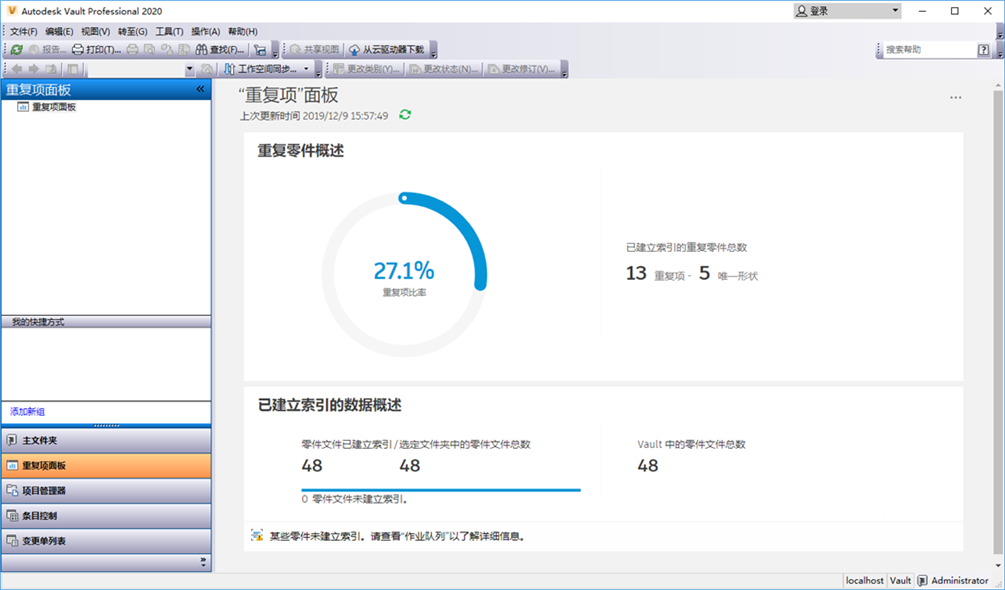 为文件建立索引后,您可以在“重复项面板”中查看数据。在 Vault Client 中,单击“重复项面板”。您可以查看重复零件报告,该报告还可以导出为 Excel、PDF 或 Word 格式。
