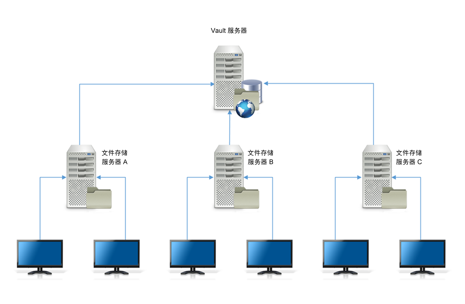 第一种方法是集中所有站点的数据库。Vault 的数据库可位于单独的服务器上,如下图所示。