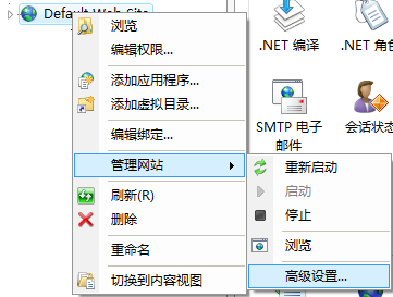 - 在“Internet 信息服务”对话框中,展开本地计算机 ►“网站”,然后在“默认网站”上单击鼠标右键,并选择“编辑绑定”>“管理网站”>“高级设置”。