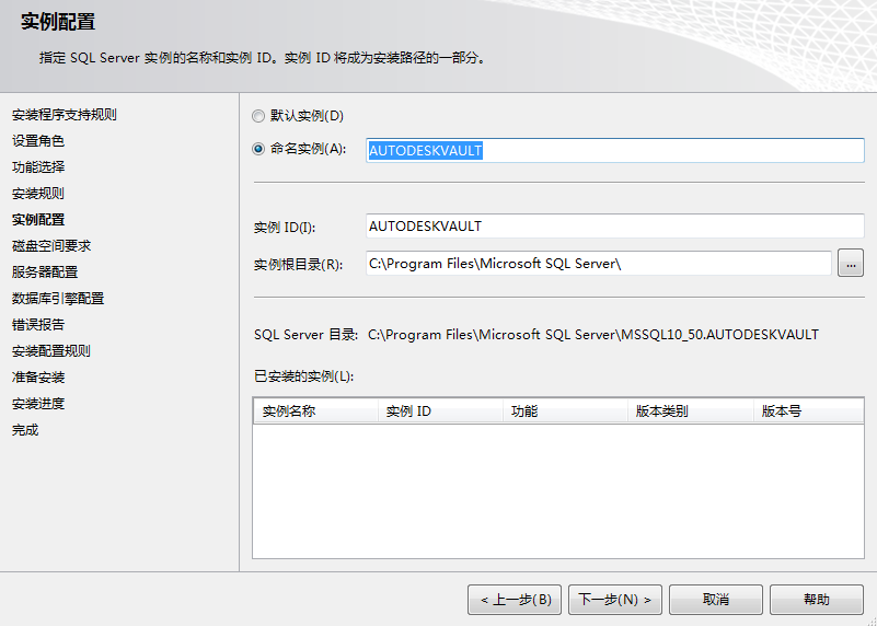 - 在“实例配置”窗口中,选择“命名实例”并输入名称 AutodeskVault。