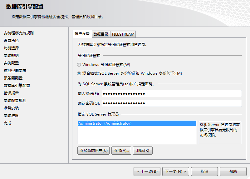- 选择“混合模式”验证,并设定 SA 密码。默认安装过程中使用的默认 SA 帐户是 AutodeskVault@26200。