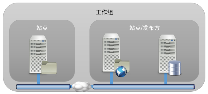 联网的工作组是对已从一个站点复制到另一个站点并通过 Microsoft SQL 数据库来管理的文件存储的配置。下图显示了典型的工作组配置。单个工作组中的所有站点都共享同一个 Microsoft SQL 服务器。