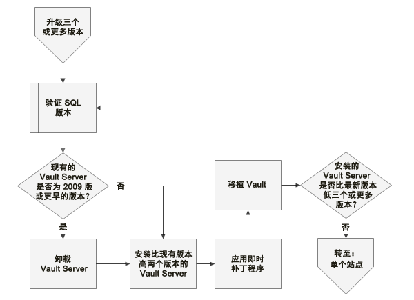 本文档中,在单个站点下升级三个或更多个版本。中间安装的目的是为了确保正确移植 SQL 数据库(此移植适用于数据库,而不是内容)。在多站点或数据同步环境中,第一个升级的服务器会移植 SQL 数据库。因此只需为第一个升级的服务器安装中间 Vault 版本。将第一个站点移植到最终版本后,所有其他站点都可以安装最终版本,并且跳过中间版本的 Vault 服务器。
