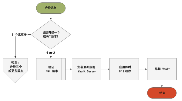 升级一个或两个版本涉及安装一个 Vault Server。升级三个或更多个版本需要在中间安装 Vault Server。