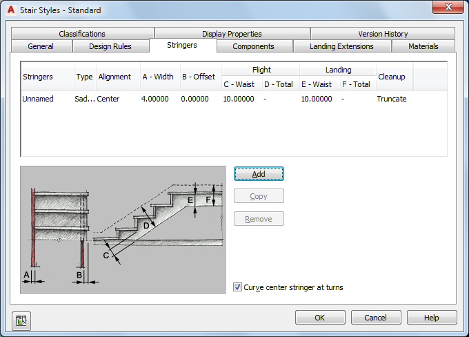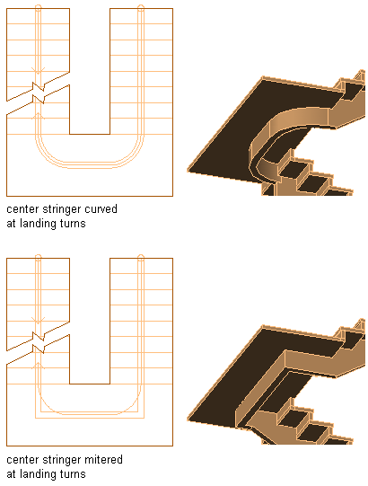 With the Curve center stringers at turns option cleared, the center stringer is mitered to match the angle of the landing turn. In most cases, this will be a right angle, but any other angle is also possible.