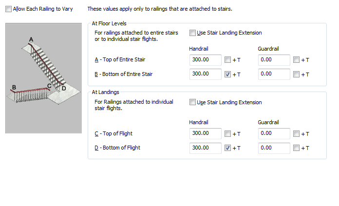 specify the length of the handrail and guardrail at the bottom of a flight under At Landings, enter values for Handrail and Guardrail. Select + T next to the value to add the tread length to the extension value.