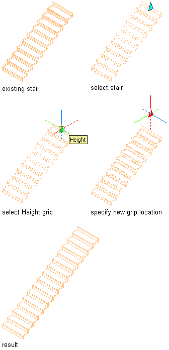 Note: If you edit the height of a stair with landings, so that a landing would be below the new height, the landing is not displayed. If you edit the height again, and move it to a location above the previous landing, the landing is no longer there. To retain the stair path, which includes the landing, use the AecStairFit command to set Automatic Landings to No.