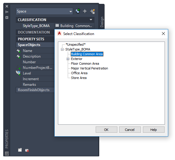 If you have generated a space that has its boundaries calculated by an area calculation standard, you may need to classify the space according to the selected standard, in order to provide the standard with the necessary information to calculate the boundaries. For example, the BOMA standard requires classifying spaces according to their space type, as the space type is relevant for determining boundary offsets.