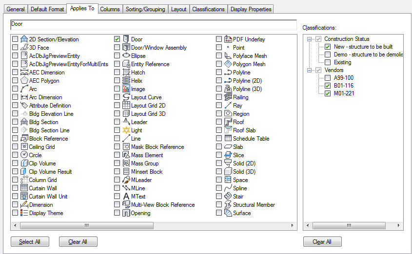 For example, if you want to schedule only doors with a New construction classification and a vendor with preferred classification, you can specify those criteria in the schedule table style. Only doors that meet both criteria can be included in the schedule table.