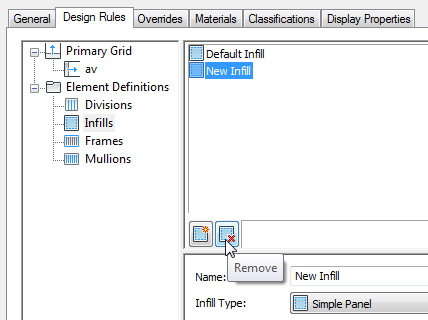 Use this procedure to delete an infill definition that you no longer need from the Infills definitions list. You cannot remove an infill definition when it is currently assigned to a cell. In addition, you cannot remove the default infill definition, but you can modify it as needed.