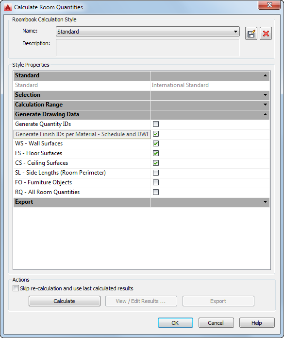 - In the Calculate Room Quantities dialog box, under Style Properties, Generate Drawing Data list, select Generate Finish IDs per Material.