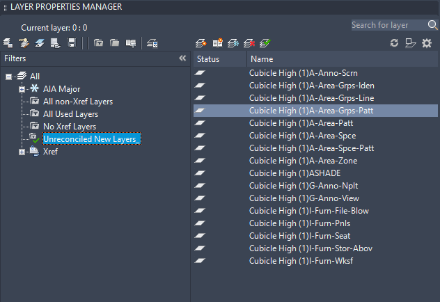When you click the link, the Layer Properties Manager opens, and the Unreconciled New Layers filter is automatically selected. All new layers that have been added to the drawing or attached xrefs are displayed in the list view.
