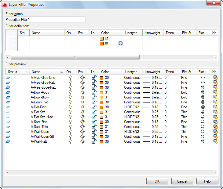 You can also specify more than one set of criteria for a property filter. For example, you can create a filter that will include all frozen red layers and all frozen blue layers. Boolean AND/OR logic is applied to the filter definitions to determine which layers to include. A layer must meet all the criteria in a single row in order to be included in the filter. Continuing with the example, a layer must be frozen and red to be in the filter. Multiple rows offer alternative criteria. In the example below, a layer must be overridden with the color 30 or it must be overridden with the color 31.