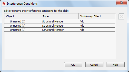 Note: You can also use this worksheet to remove an interference condition by right-clicking its Object or Type value and then clicking Remove. The alternate method is to use the contextual tab of the slab or roof slab, as explained in To Remove Slab/Roof Slab Interference Conditions. When you remove an interference condition, you remove the association between the slab or roof slab and the object that was used to create the interference condition. The object itself is not removed from the drawing.