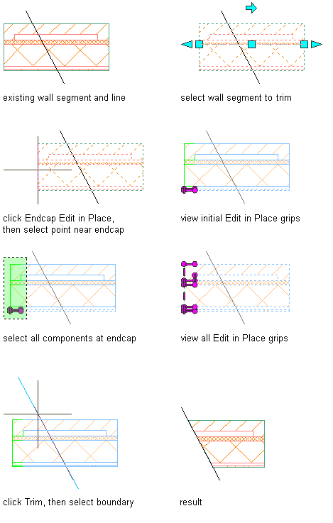Use this procedure to modify a wall endcap by trimming a component. A trim boundary may be a line, arc, circle, polyline, or wall component edge.