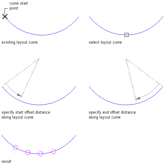 | Space a fixed number of nodes along the curve | enter s (Space evenly). Specify the start and end offsets of the first and last nodes, and specify the number of nodes. |
