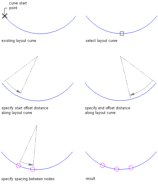 | Repeat nodes at fixed intervals along the curve | enter r (Repeat). Specify the start and end offsets of the first and last nodes, and specify the spacing between nodes. |