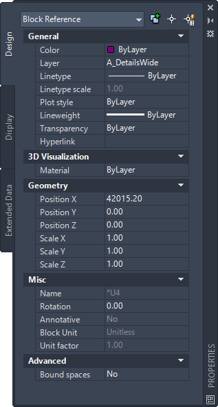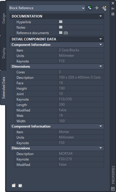 The following image shows the Extended Data tab of the Properties palette for a concrete masonry unit detail block.