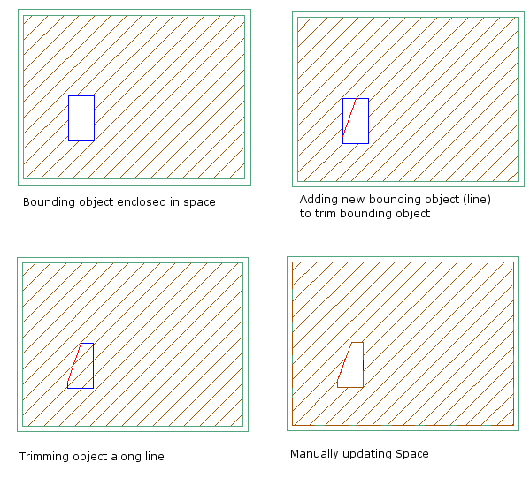 When trimming a boundary object by substituting a new boundary object in the trimming position, the new object will not be recognized automatically as boundary object for the space, because it did not bound the space previously. In this case, you need to update the space manually to recognize the new bounding object. See the following example: