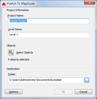 If the drawing from which you want to publish objects is part of a building project, the project name and level assignment of the drawing display in the Publish to MapGuide dialog box.