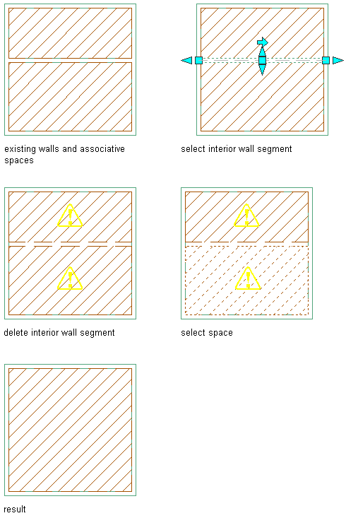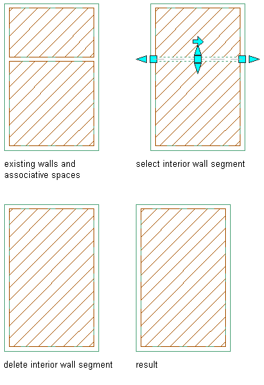If the automatic update of associative spaces is not activated, you need to merge spaces between deleted boundary objects manually. This process involves more steps than the automatic update, but allows you more control over which space’s properties are retained in the resulting space.