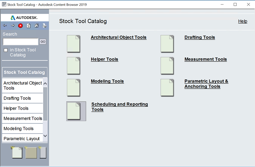 Categories can be subdivided into one or more levels. If subcategories exist, a list of subcategories appears when you move the pointer over the category name in the left pane. For example, in the Stock Tool catalog, move the pointer over Modeling Tools to see the Mass Element Tools and 3D Solids subcategories.