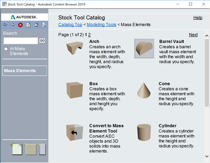 A tool catalog category may contain more items than can fit on a page. If multiple pages are needed, navigation controls appear at the top and bottom of each page. The Mass Element Tools category shown earlier requires two pages to display its contents. You can specify the page to be displayed by clicking the page number or by clicking Next or Prev. (Note that these controls appear at the bottom of the page too.) You can also change the number of items that display on a Content Browser page.