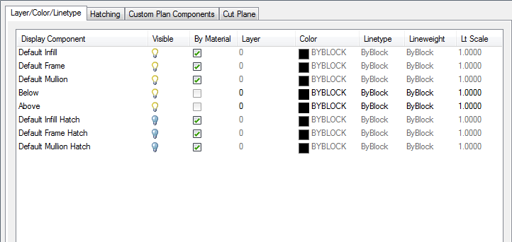 Use this procedure to specify the properties of one or more cut planes for a door/window assembly style. Cut plane display properties apply only to display representations, such as Plan, that are used in Top view (Plan view) of a drawing.