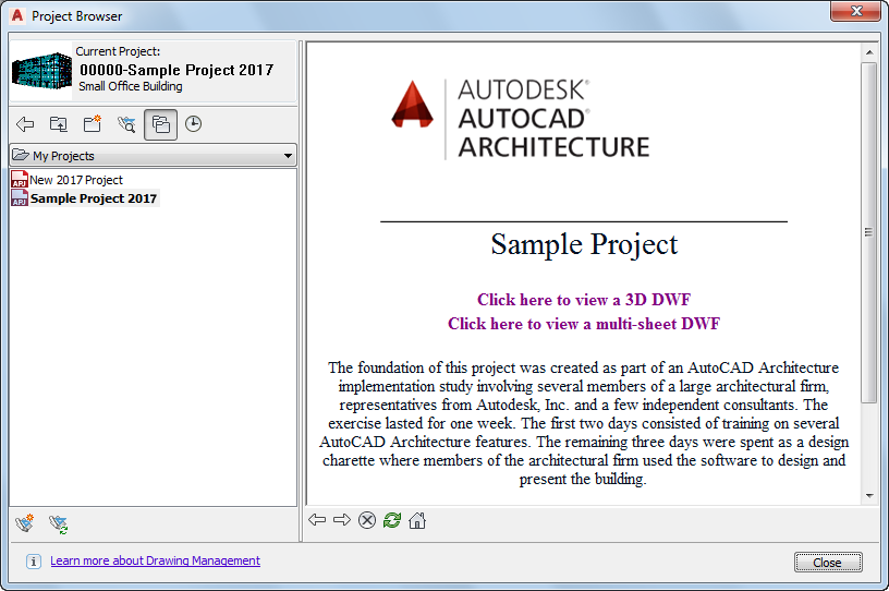 In the Project Browser, you create new projects, configure the project settings and project standards, add detail information, and select the current project. When you set a project current, either from the context menu or by double-clicking the file name, the project is migrated to a format compatible with the current version of AutoCAD Architecture toolset. If you also repath the project, all project drawings are migrated as well, and you will be unable to open the project in any older version of the software.