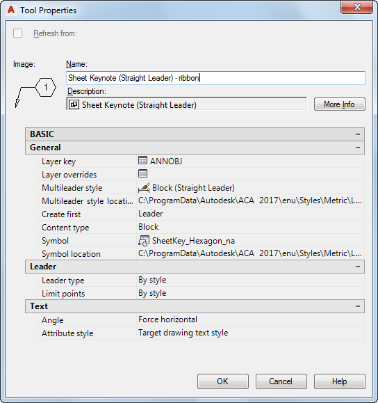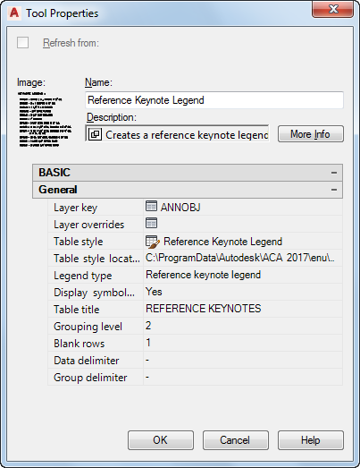 AutoCAD Architecture toolset provides several default tools for inserting keynotes into a drawing. If your software has not been customized locally, these tools can be found on the sample Annotation tool palette. They are also accessible from the Documentation Tool Catalog in the Content Browser and can be copied to any tool palette using the i-drop