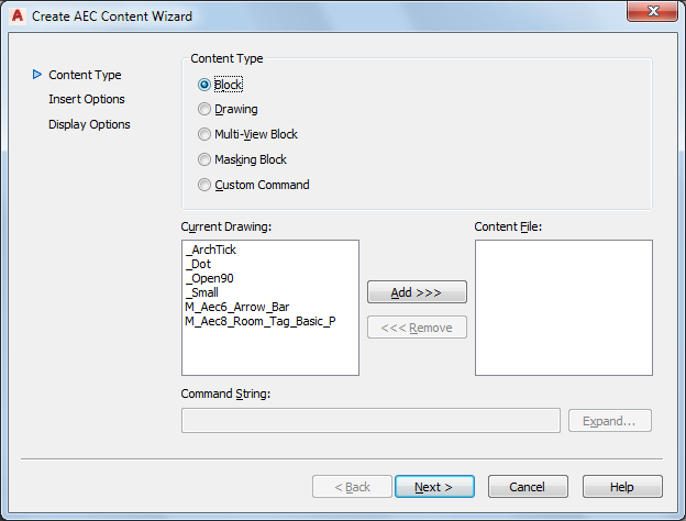 The AEC Content Wizard helps you create custom content. You can create blocks, drawings, and commands from data existing in the current drawing.