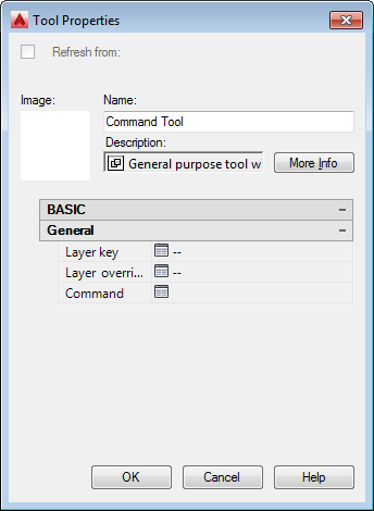 - Command Tool: A simple blank command tool that lets you execute a number of command sequences. Allowed commands include AutoCAD and AutoCAD Architecture toolset commands, VBA macros and applications, AutoLISP routines, and scripts.