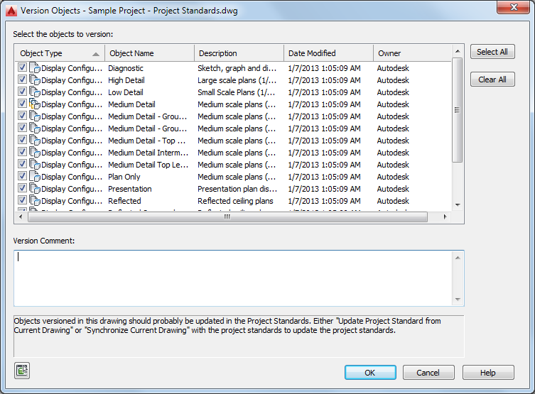 Display settings in the project standards display drawing and in the project drawings are versioned. The version is used to determine whether a display setting needs to be updated during synchronization. The version information includes the GUID (Global Unique Identifier), the date and time of the last modification, the windows login name of who last modified the item, and an optional comment.