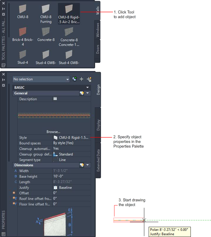 Note: Certain values can be set only when you are inserting the object; for example, the position of a door along the wall into which it is inserted can be defined only when you are inserting the door. You cannot change the position for an existing door later. Values that can be set only during insertion are marked with this symbol