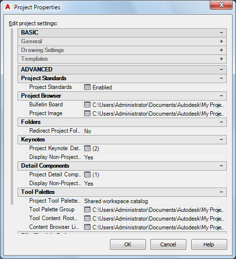 You can define or modify advanced project properties such as standards, images, keynotes, detail components, and tool palettes.
