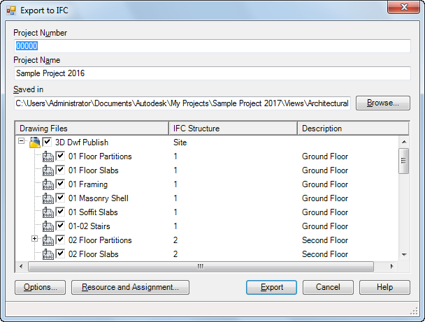 You control which xrefs in the project file are exported and how they display in the IFC file by either accepting the default level assignments or by specifying a different label. All drawings that are assigned to the same IFC Structure are exported into an IfcBuildingStorey in the IFC file.