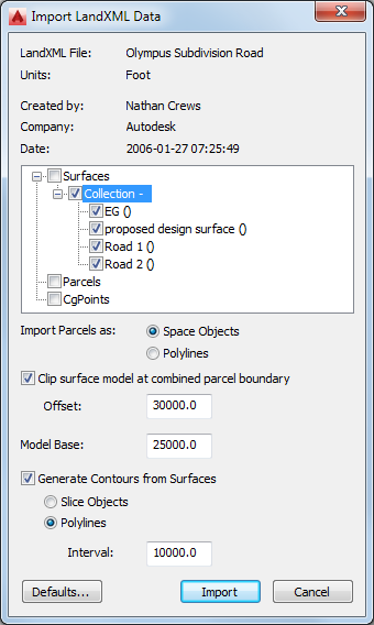 - In the Import LandXML Data dialog box, select the import options.