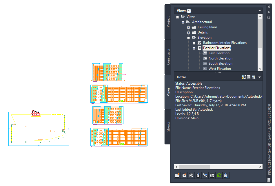 You create a view drawing by selecting constructs from the Project Navigator palette and referencing them into the view drawing. When you are creating multi-level views, each construct is referenced at its relative level height, with the lowest level inserted at Z = 0.