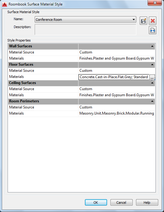- In the Roombook Surface Material Style dialog box, create or edit existing surface material styles or load surface material styles from the catalog.